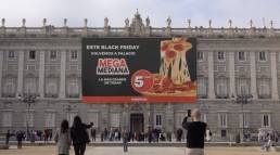 Madrid, 22 de noviembre – Creando un impactante espectáculo visual, Telepizza ha dado el pistoletazo de salida a su particular Black Friday con una acción que ha transformado la fachada del Palacio de Madrid. La marca se ha sumado a la tendencia Fake Out-Of-Home desplegando una megalona gigante sobre el Palacio con la que aprovecha para promocionar que la pizza mediana más grande de todas, su Megamediana, tan sólo cuesta 5,95€ durante esta semana.